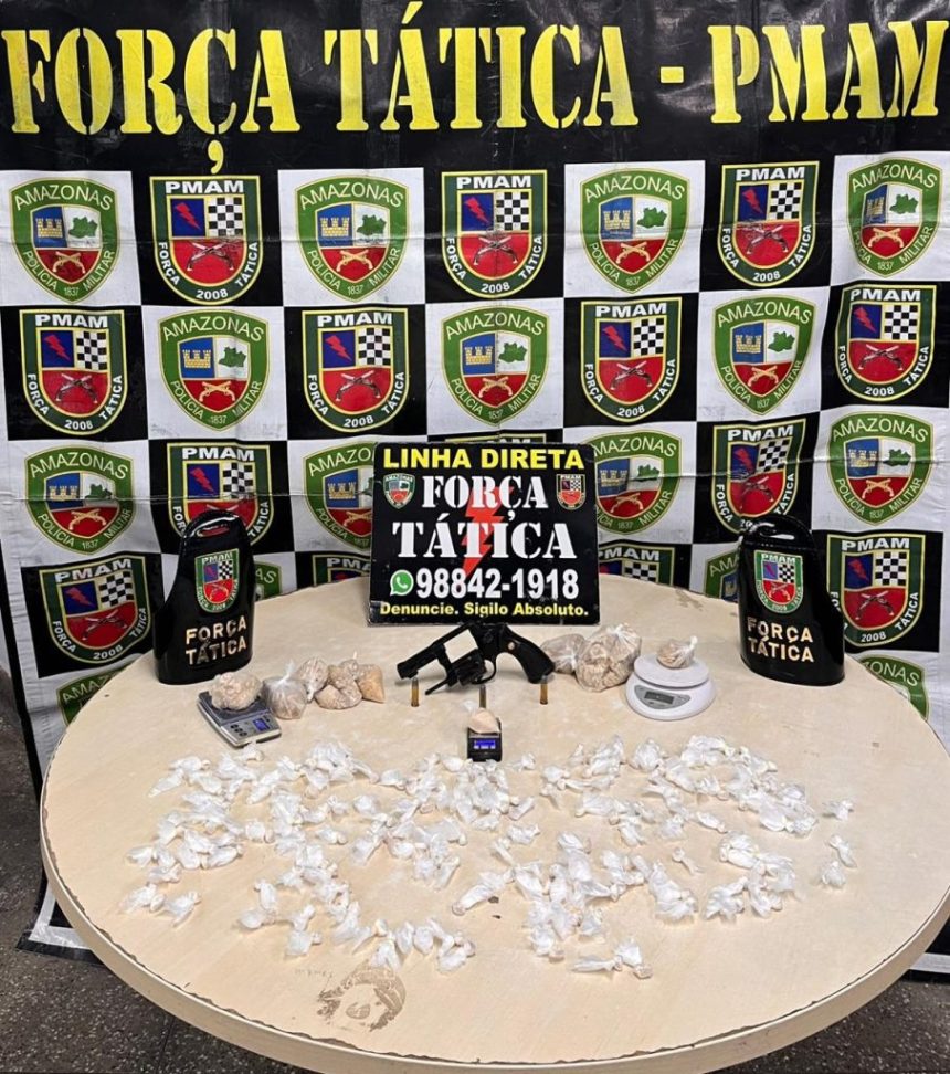 A Polícia Militar do Amazonas (PMAM), por meio da Força Tática, apreendeu entorpecentes e uma arma de fogo na madrugada deste sábado (10/01), no bairro Jorge Teixeira, zona leste de Manaus.