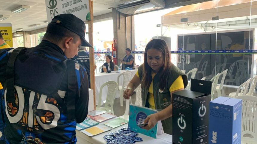 No estande da FVS-RCP, técnicos orientam a população sobre prevenção de acidentes de trânsito e infecções sexualmente transmissíveis (ISTs), além de distribuir materiais informativos, preservativos internos e externos, gel lubrificante e o novo preservativo texturizado.