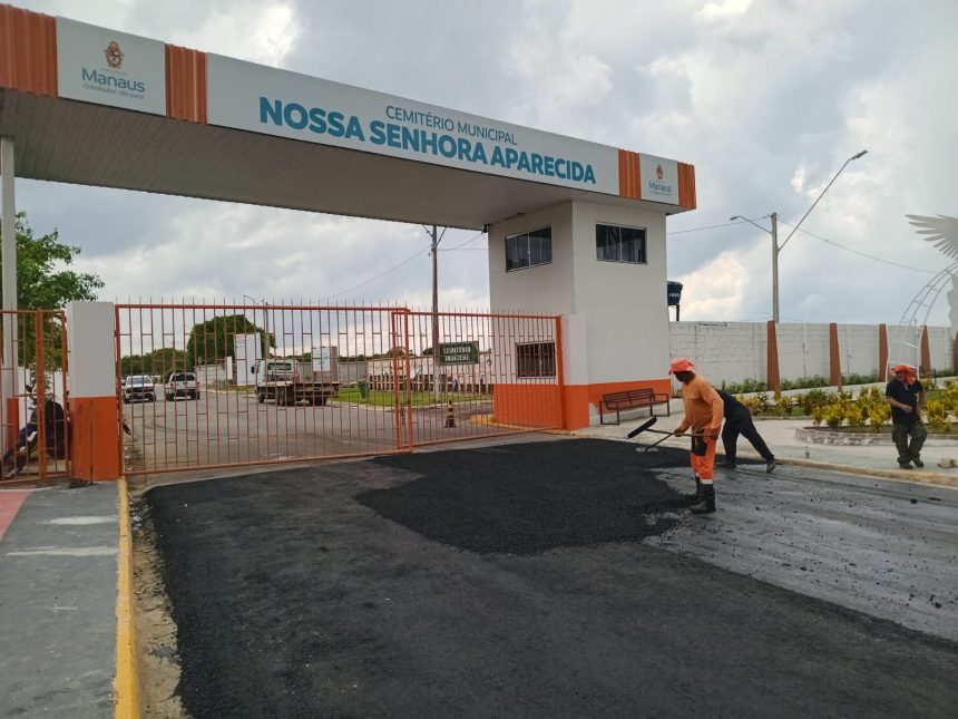 A Prefeitura de Manaus, por meio da Secretaria Municipal de Infraestrutura (Seminf), realiza, nesta quinta-feira, 16/10, o serviço de recuperação asfáltica no cemitério municipal Nossa Senhora Aparecida, no bairro Tarumã, zona Oeste. A intervenção visa melhorar as condições viárias desse espaço.
