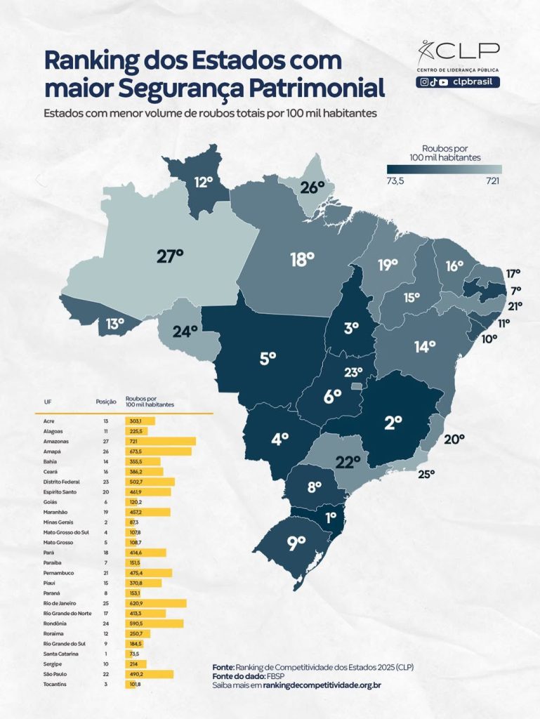 Segundo o estudo, o Amazonas está em último lugar entre os Estados em segurança patrimonial. Nesse ranking, Santa Catarina é o melhor colocado, seguido por Minas Gerais (2º colocado) e Tocantins (3º).
