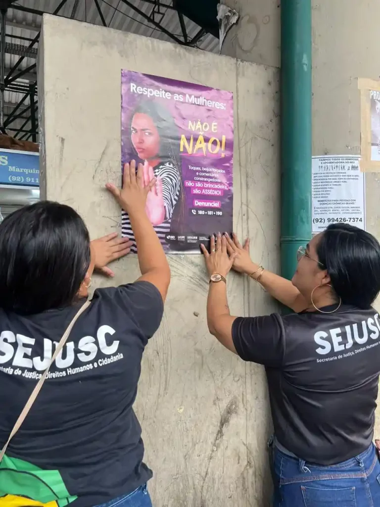 A Secretaria de Estado de Justiça, Direitos Humanos e Cidadania (Sejusc) realizou, nesta terça-feira (02/12), uma mobilização no Porto Terminal Hidroviário de Manaus, zona sul, em apoio ao “Dia M: Mulheres, Mobilidade e Mais Respeito”, data que reforça o enfrentamento à importunação sexual e outras violências contra mulheres. As abordagens também foram realizadas, simultaneamente, em todos os terminais de ônibus e na rodoviária, com entrega de informativos e orientação ao público.