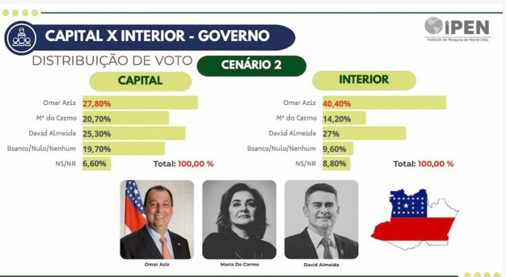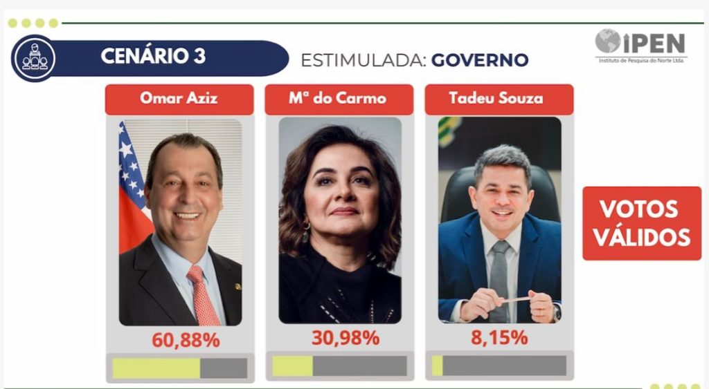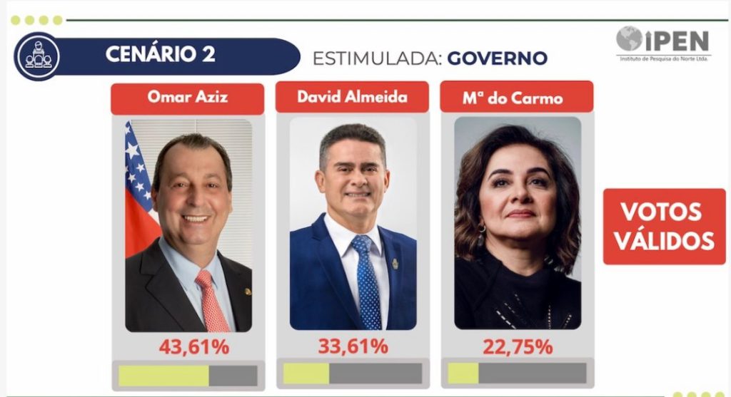 Nos cenários simulados, o senador vence três nomes dos mais cotados: a empresária e pré-candidata Maria do Carmo, o vice-governador Tadeu de Souza e o prefeito de Manaus, David Almeida, ainda que este tenha declarado que não tem plano de disputar as eleições de 2026.